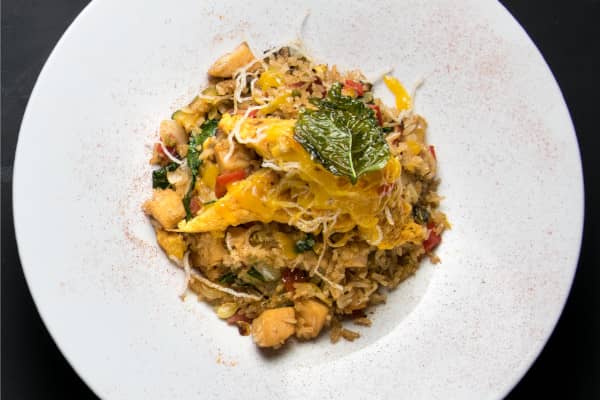 Calamares y tocineta ahumada salteados al wok con vegetales, toques dulces y salados, aromatizados con especias tailandesas.