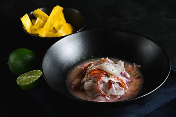 Pescado blanco en leche de tigre, cilantro, cebolla morada, acompañados de camote, canchita, maíz dulce y arena de patacón.