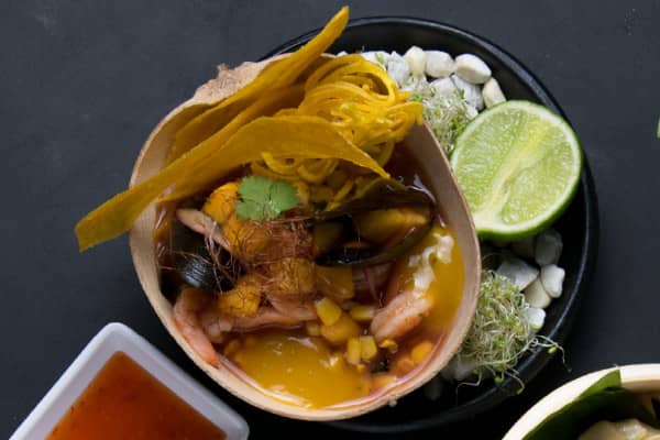 Combinación de sabores caribeños con el camarón y calamar, toques dulces y salados acompañado de crocantes de plátano, (12 oz).