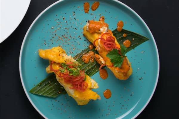Pure de papa ligero con toques peruanos, una de pollo y otra de chicharrón de pescado, con aguacate, huevo y maíz.