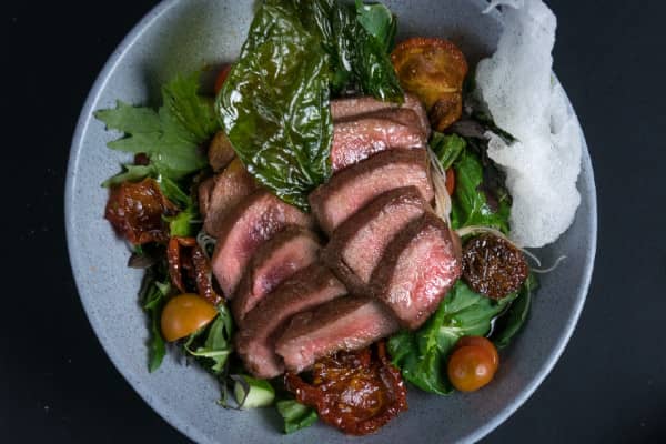 Mezclum de lechugas, tomates secos hidratados en vinagreta de hierba buena con nuestro lomo de res o pollo sellado al estilo robatayaki, aderezado con salsa ponzu.
