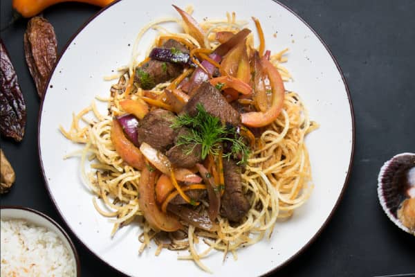 Clásico de la comida chifa. Lomo sellado al Wok, salteado con cebolla, tomates y cilantro, toque de ajíes amarillo soya y gengibre. Acompañado de arroz blanco y papa.