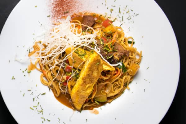 Fideos salteados al estilo cantonés, con lomo de res, verduras frescas, toques dulces y salados preparados en wok.