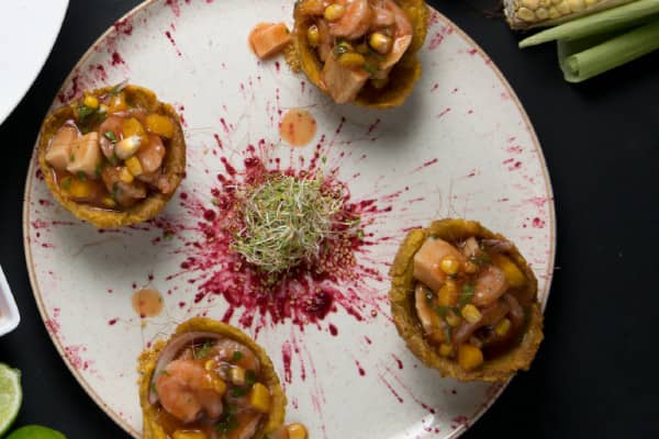 Cuatro canastas de plátano rebosadas de nuestro cóctel de camarones y corona de aguacate.