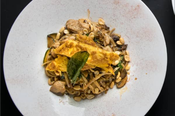 Plato representativo de Thailandia, hecho con fideos de arroz, strips de pollo, verduras salteadas al Wok, queso tofu, salsa de tamarindo, maní y aromas de albahaca siam.