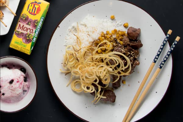 Lomito de res salteado en salsa teriyaki, acompañado de arroz blanco y maíz tierno, jugo de cajita y copita de helado.